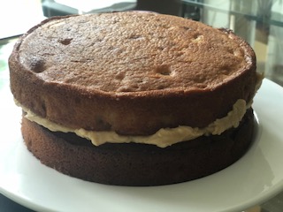 The filling for this cake also looked very elaborate - a buttercream that involved using milk, flour and sugar, heated in a pan -I usually just mix butter and icing sugar! I didn't have a lot of time so decided to make my usual easy buttercream but flavoured with cinnamon, as in the recipe, but also add a splash of apple juice.The top of this cake would look nice decorated with sliced apple but again as I was only using storecupboard ingredients I didn't have any. Here's what I did - I'm calling this an original recipe as it was so far removed from the one in the book!